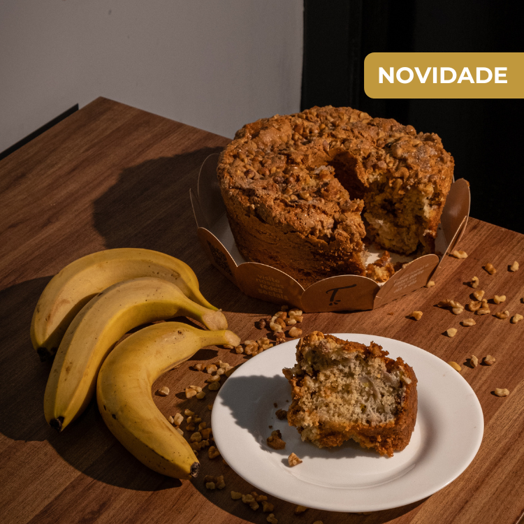 O tradicional Bolo de Banana com Canela + O amado Bolo de Maçã com Canela e Nozes = Bolo de Banana com Canela e Nozes! Uma combinação única: o sabor marcante da banana, o toque aconchegante da canela e a crocância das nozes em cada pedaço.